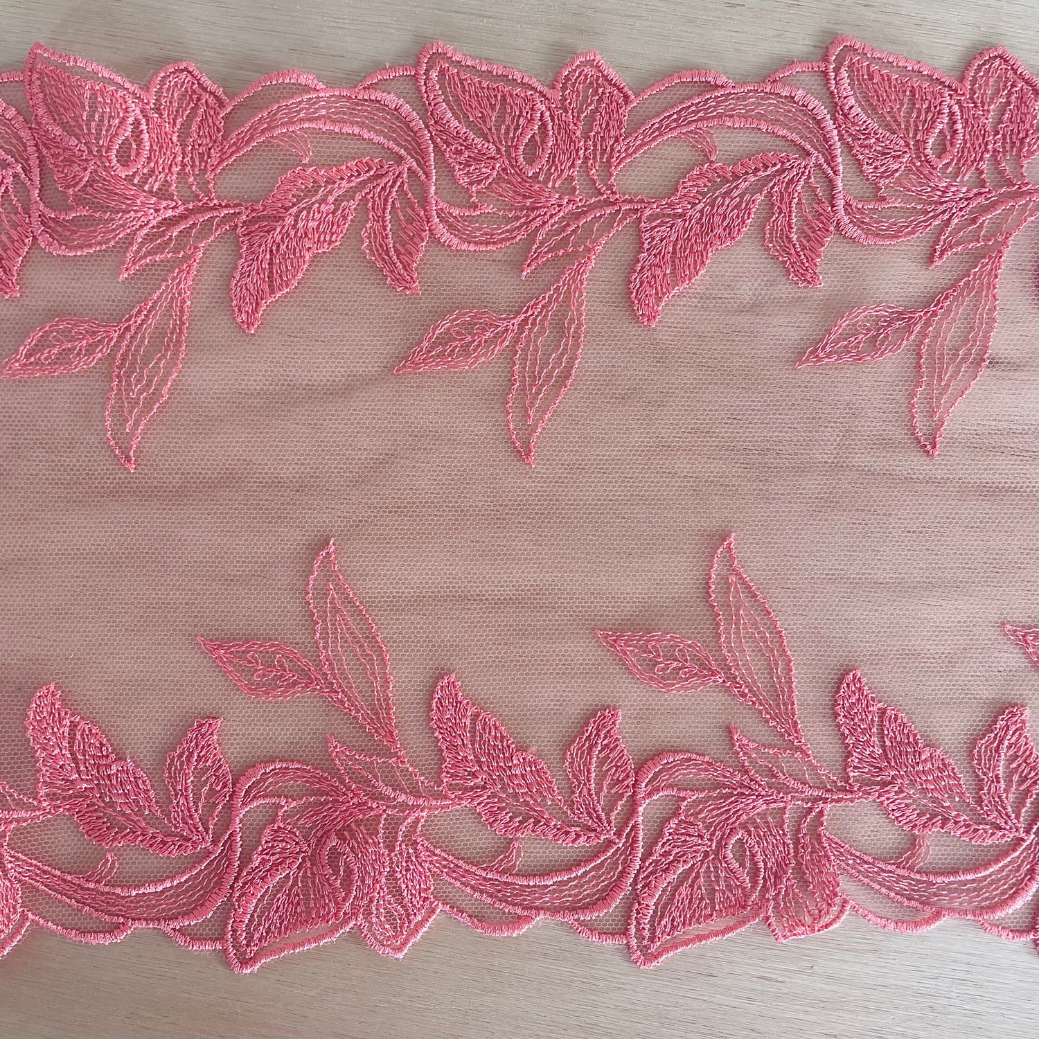 Soft Coral Foliage Embroidered Tulle Double Galloon | 17cm Wide | Price per metre